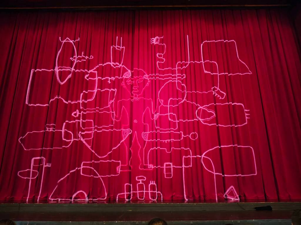 坐進戲劇院,大絨布上漸漸的有手繪圖騰的投影。